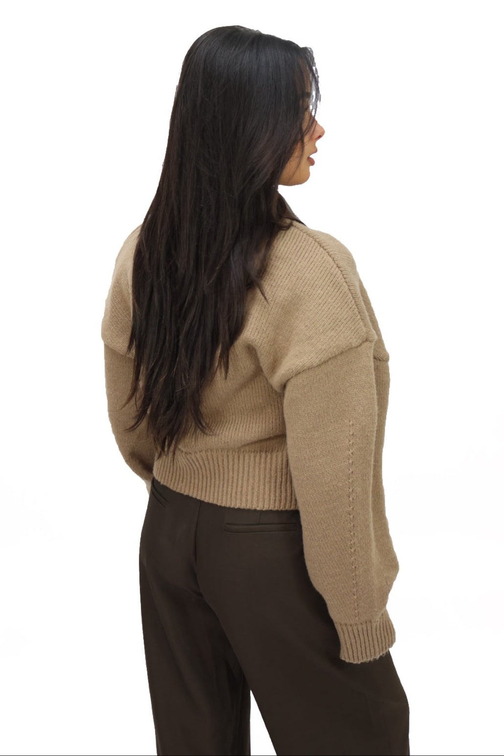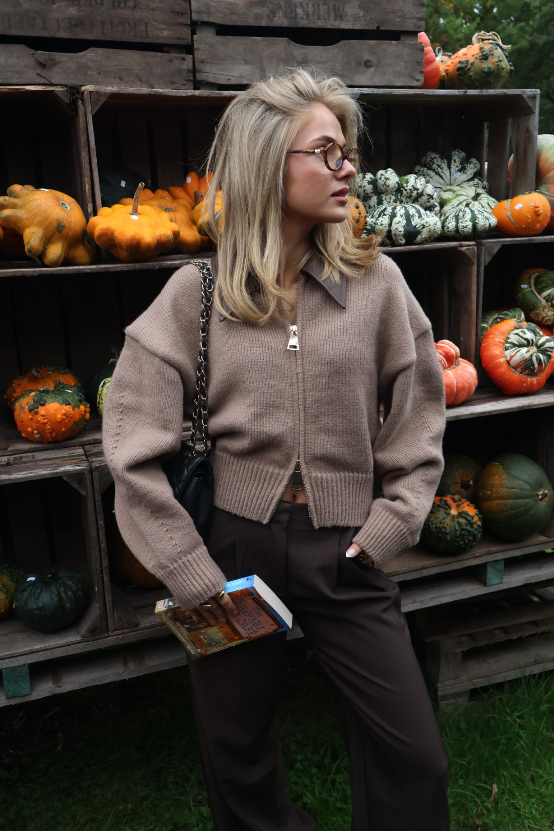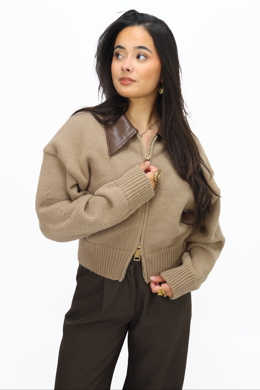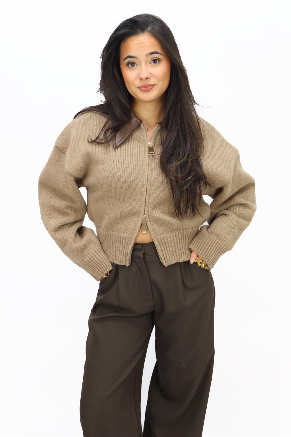 Olive Zip Vest er alt, hvad du leder efter denne sæson, piger! Kombinationen af den grove strik og læderkragen giver vesten et trendy, unikt look. Modellen er lidt kortere og har en afslappet pasform – perfekt til at bære over bukser for et lidt mere elegant look eller til at gå casual med dine yndlingsjeans.