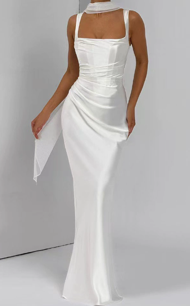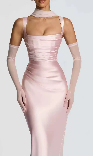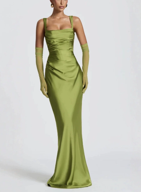 Calanthe Maxi-kjolen har en satinfinish med en firkantet halsudskæring med elegante folder. Asymmetriske folder fremhæver overdelen, der suppleres med smalle stropper og snørelukning bagpå for en raffineret, taljeret pasform.