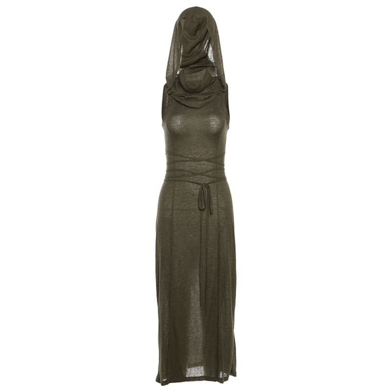 Hættetrøje uden ærmer, udskæring, selvbunden krave, udskåret maxi-kjole