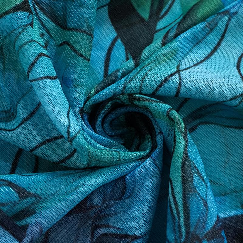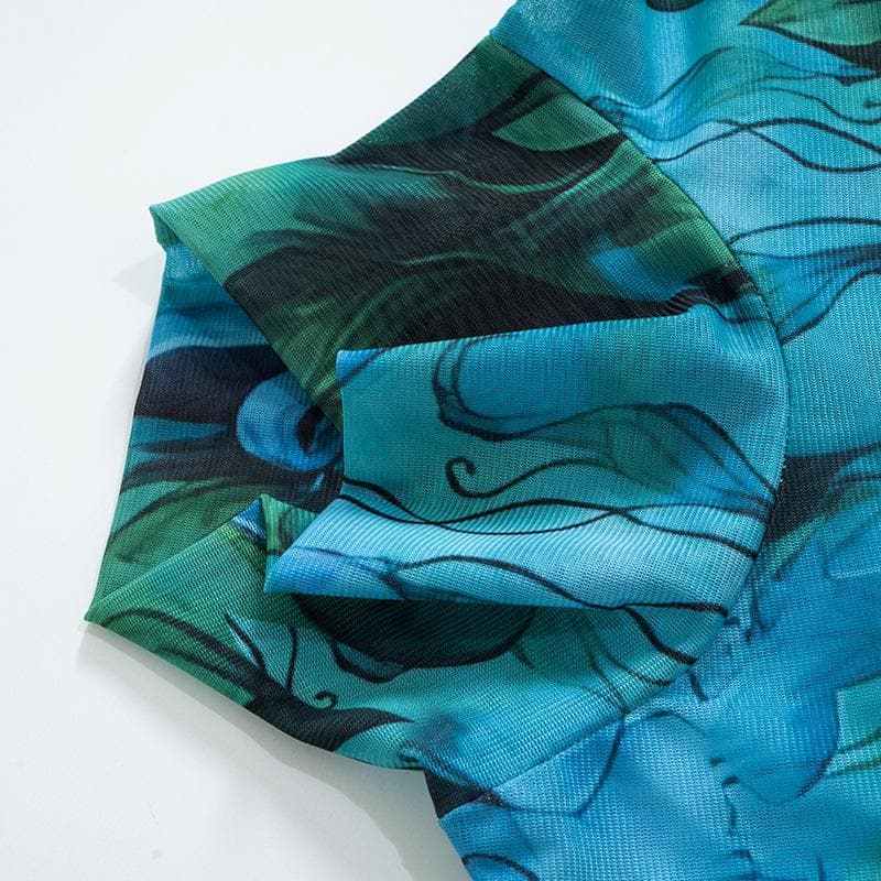 Gennemsigtig mini-kjole med høj halsudskæring, slids og lange ærmer i tyndt netstof med print